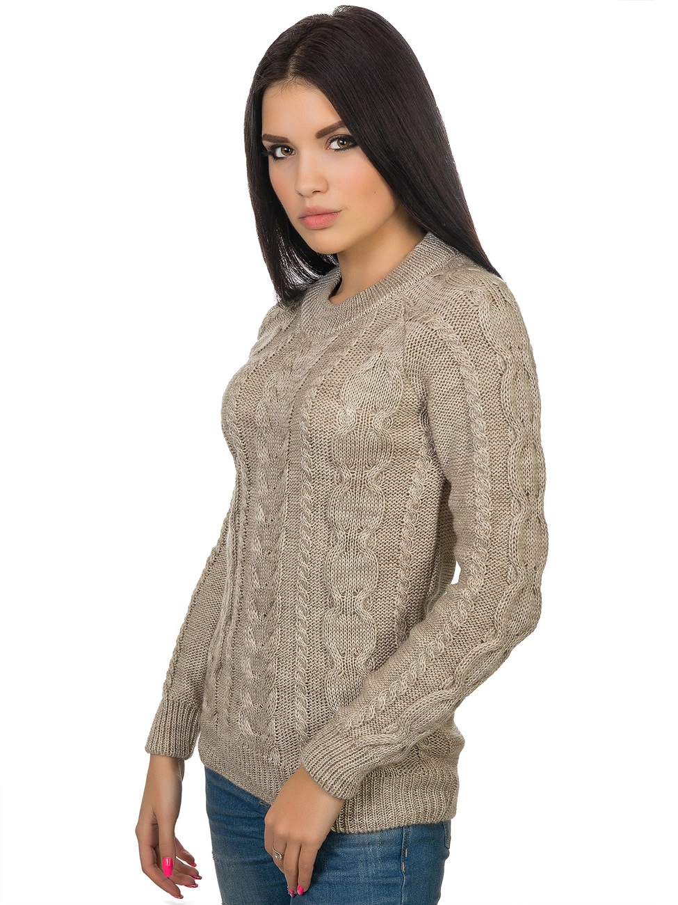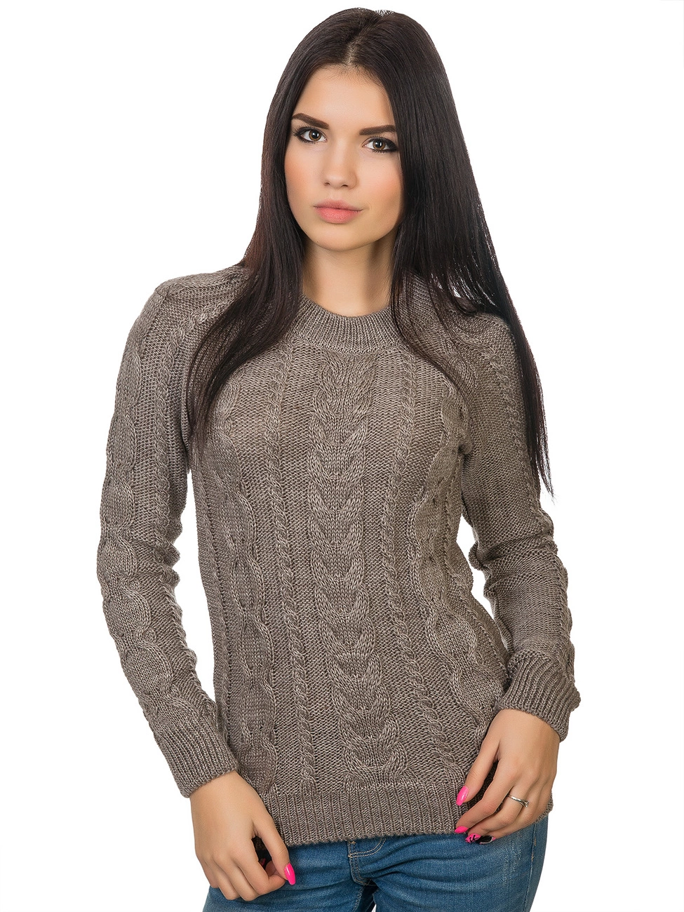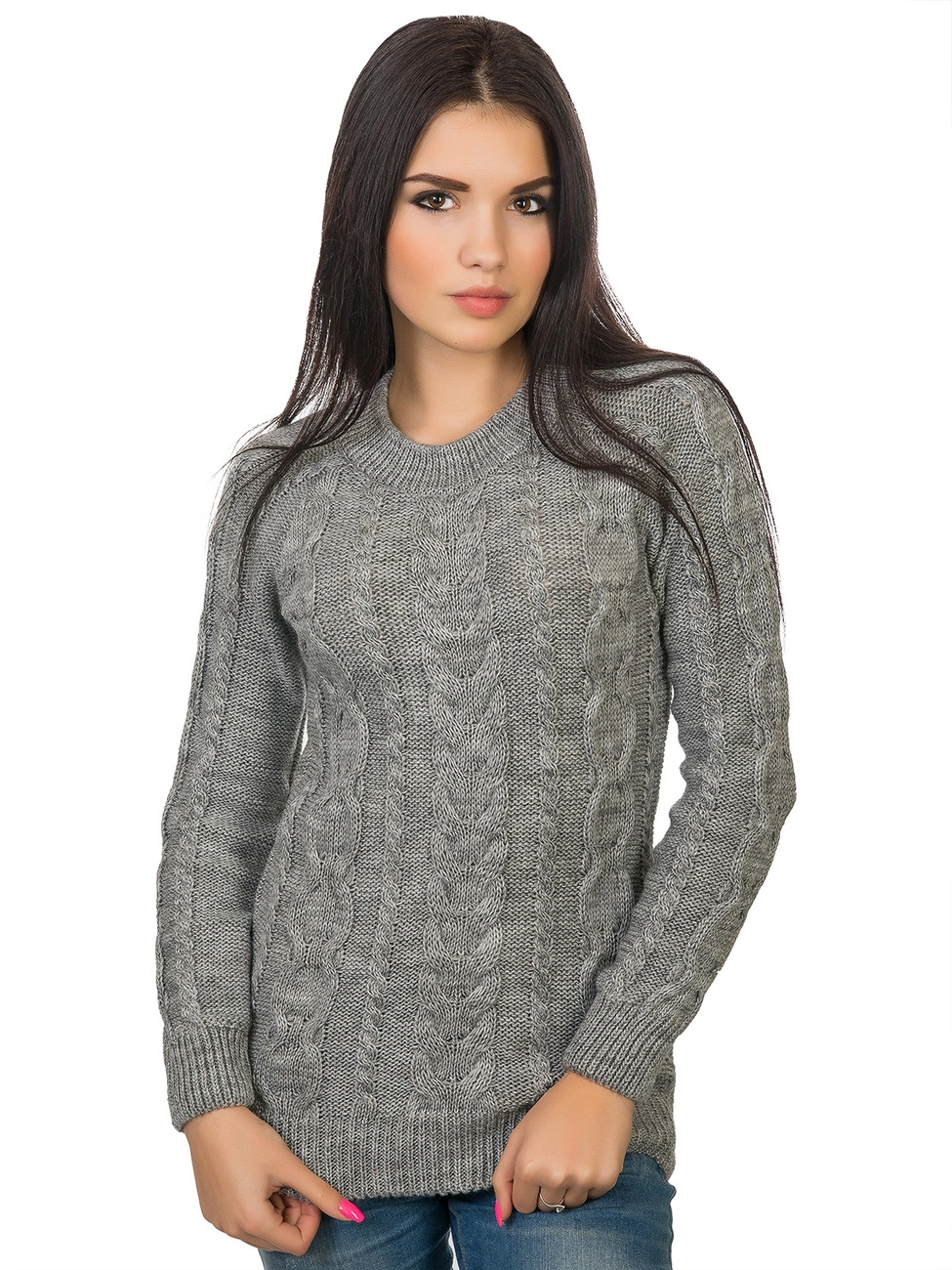 фигурной вязкой - косами. Круглая горловина, длинный рукав-реглан и