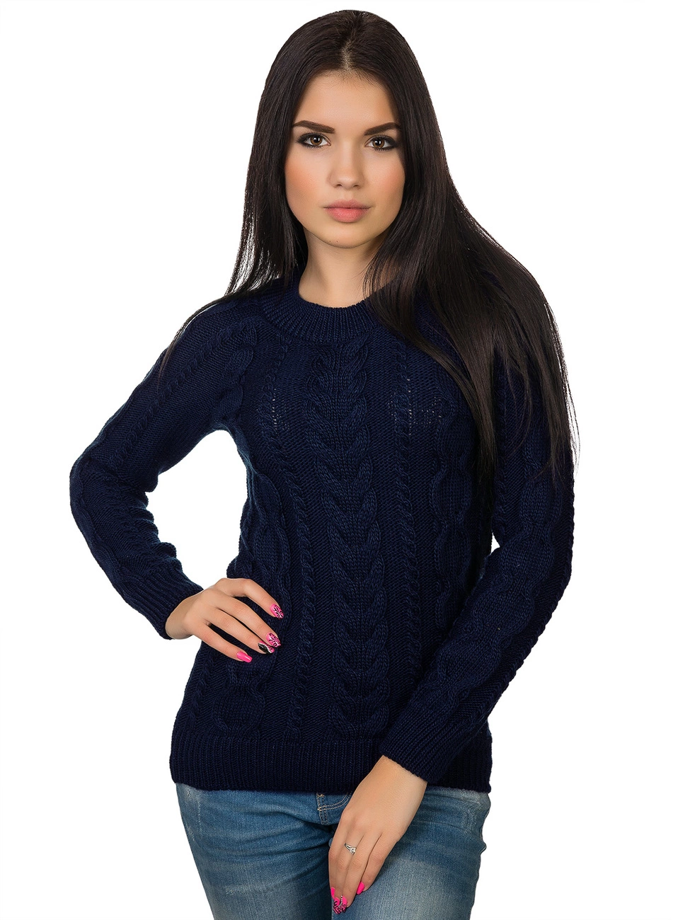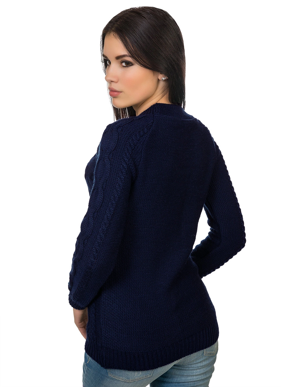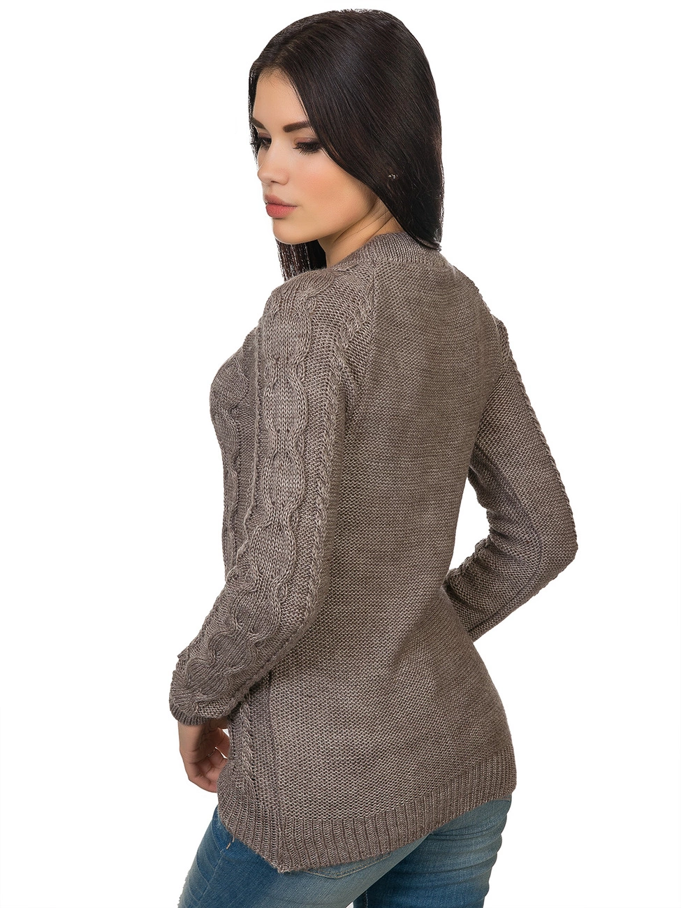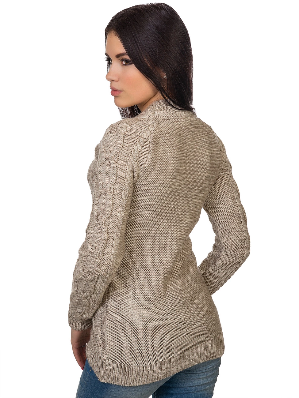 фигурной вязкой - косами. Круглая горловина, длинный рукав-реглан и