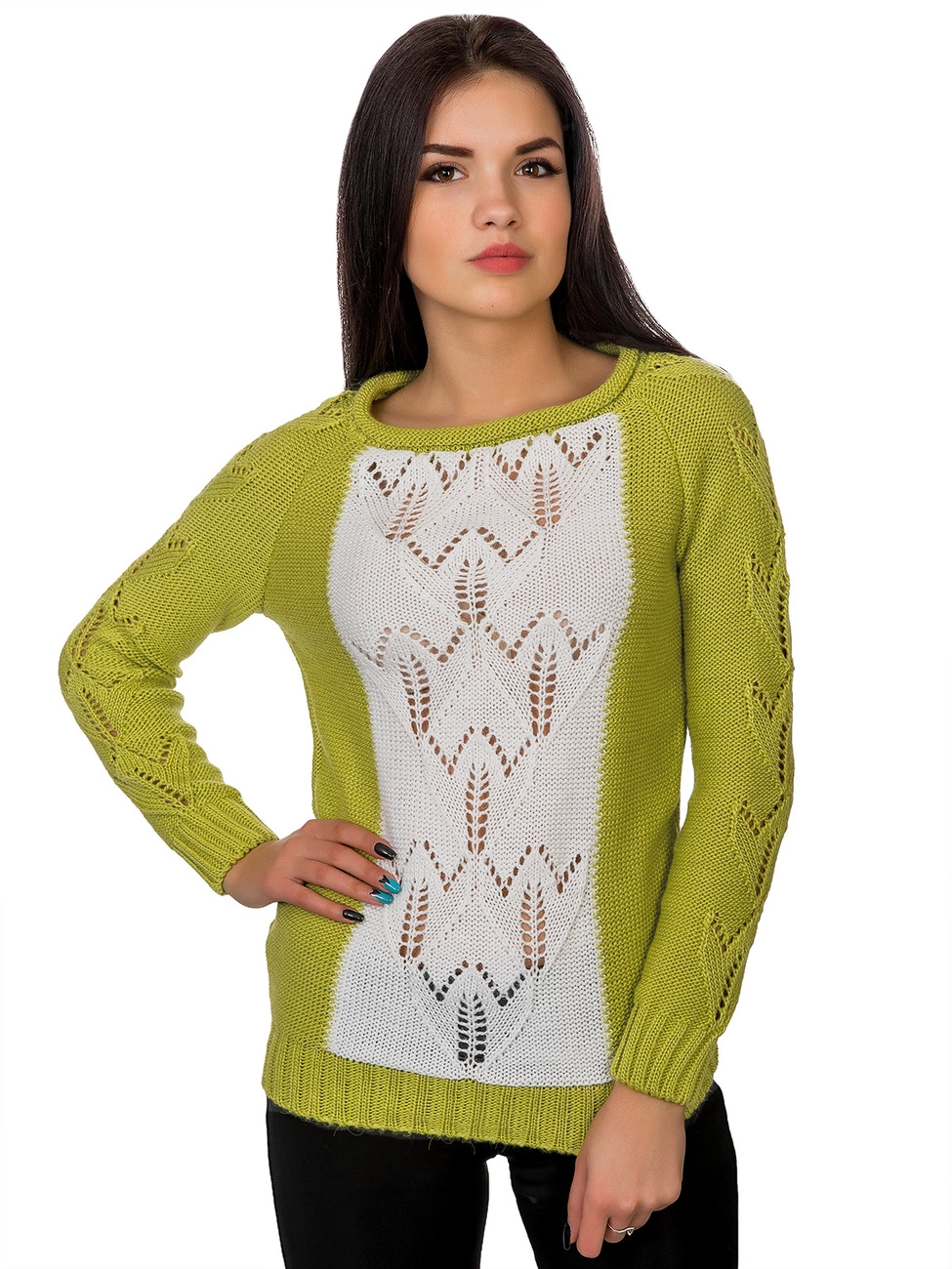 приятной на ощупь пряжи, впереди украшенный вставкой. Рукава и низ