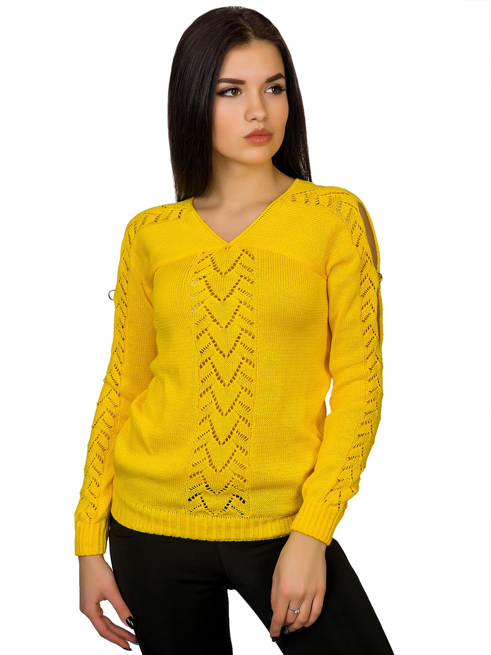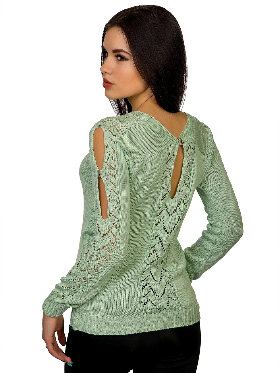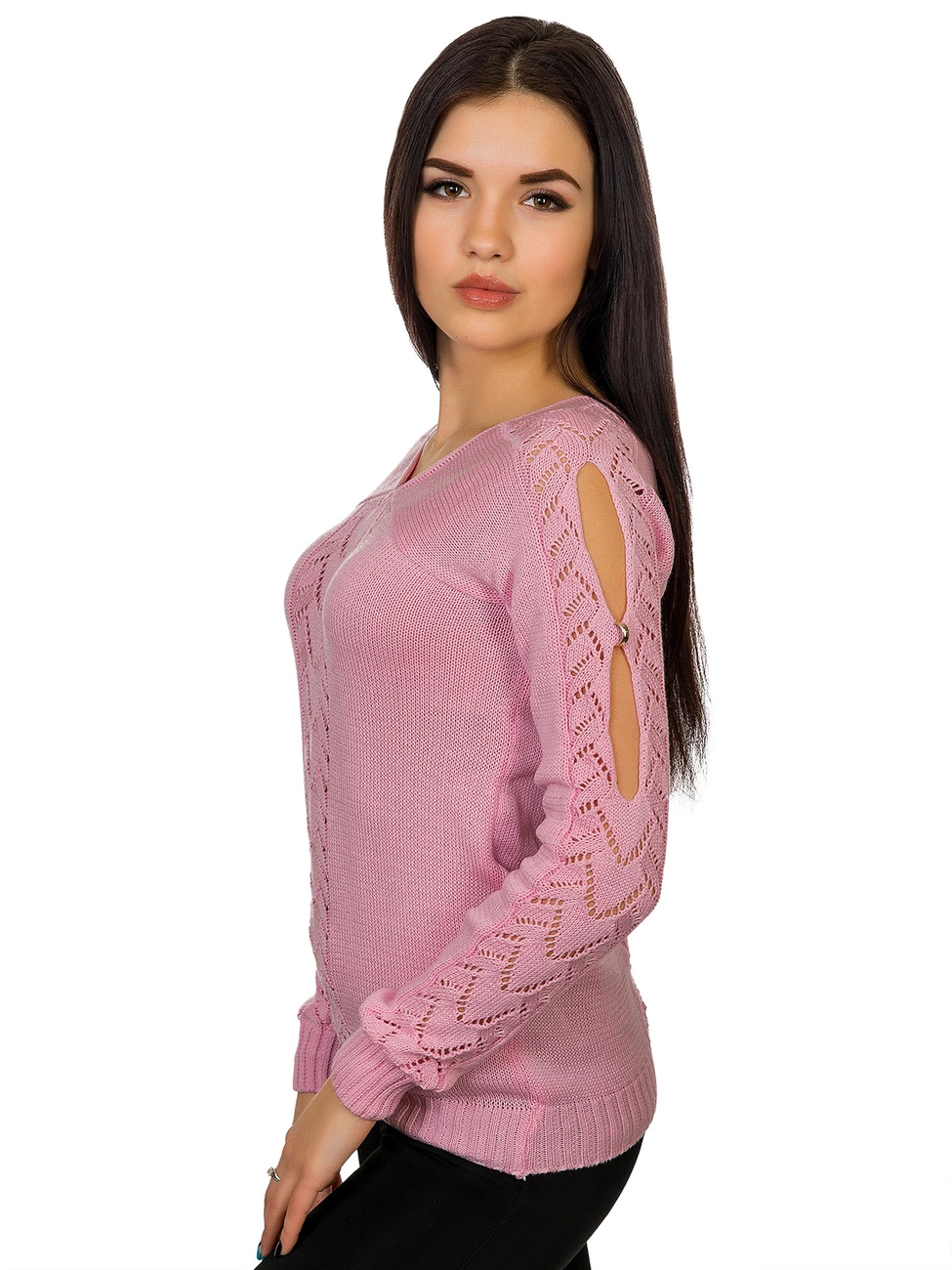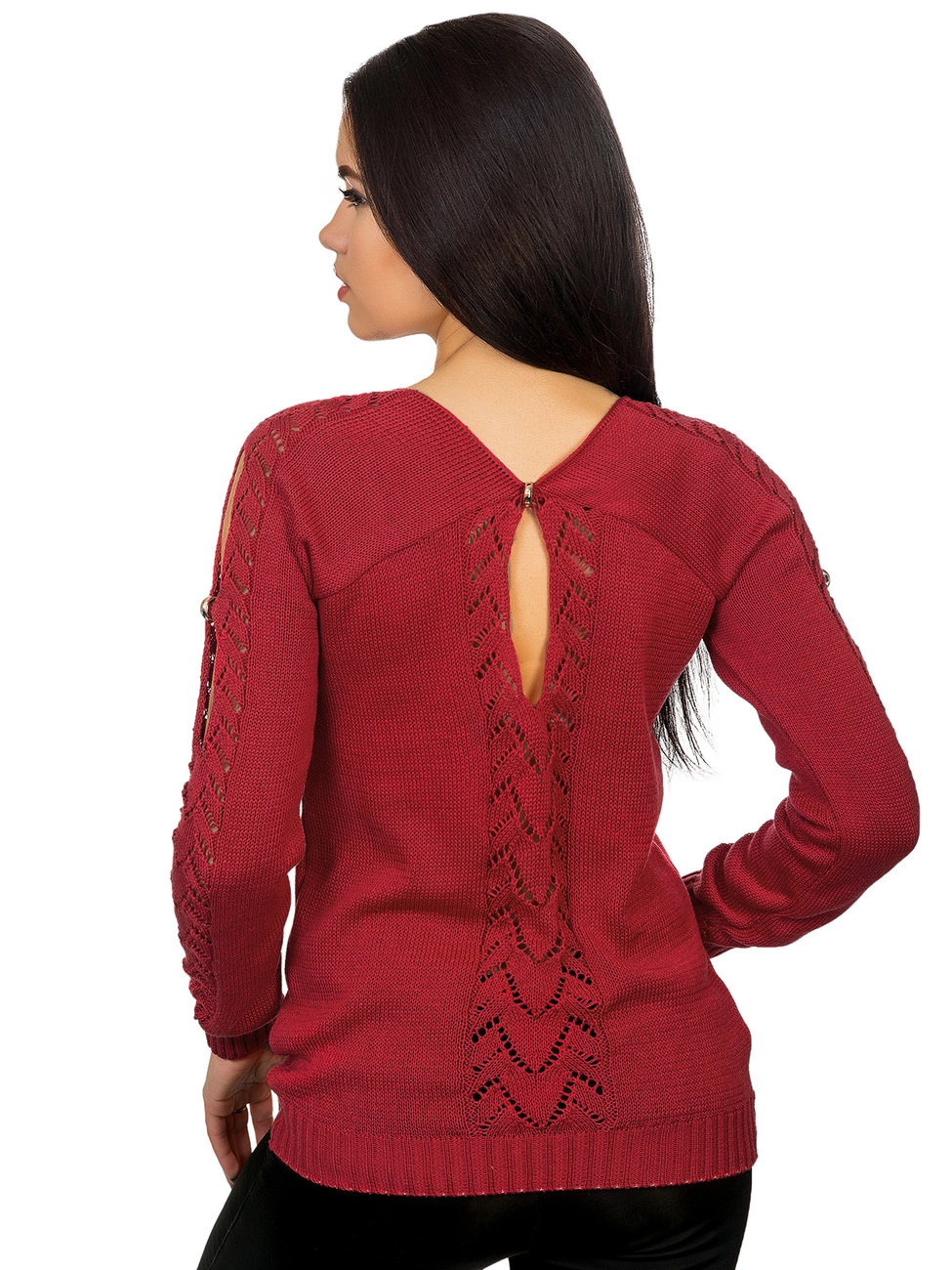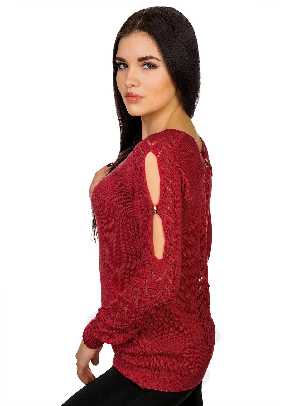 украшенный ажурной вязкой и вырезами с фурнитурой в виде колечек.