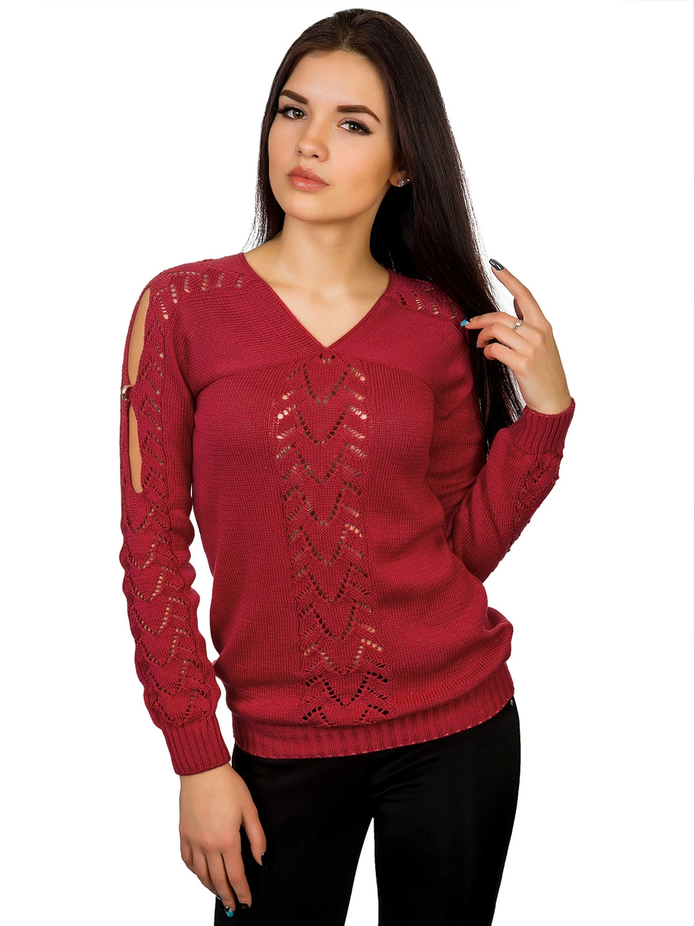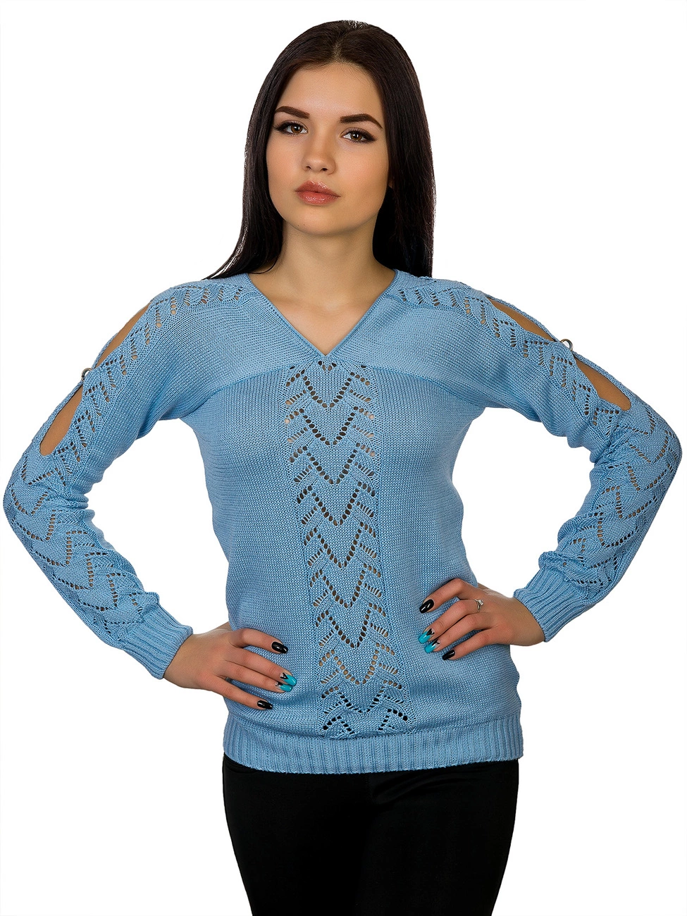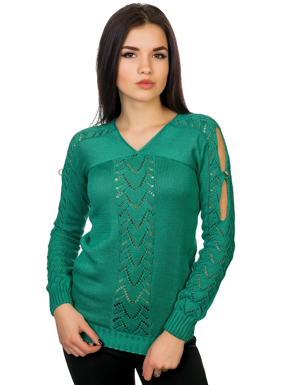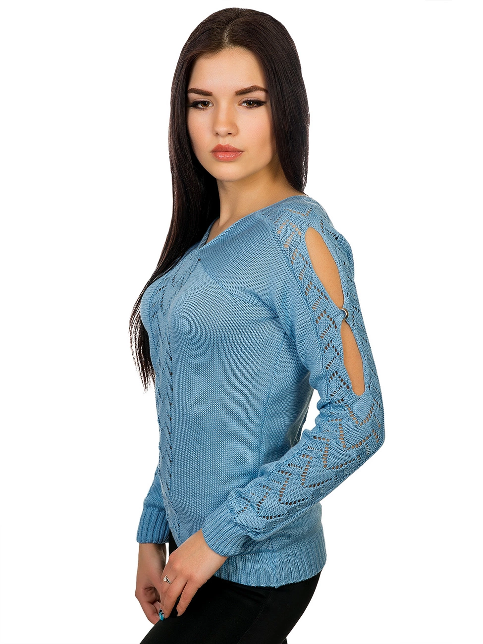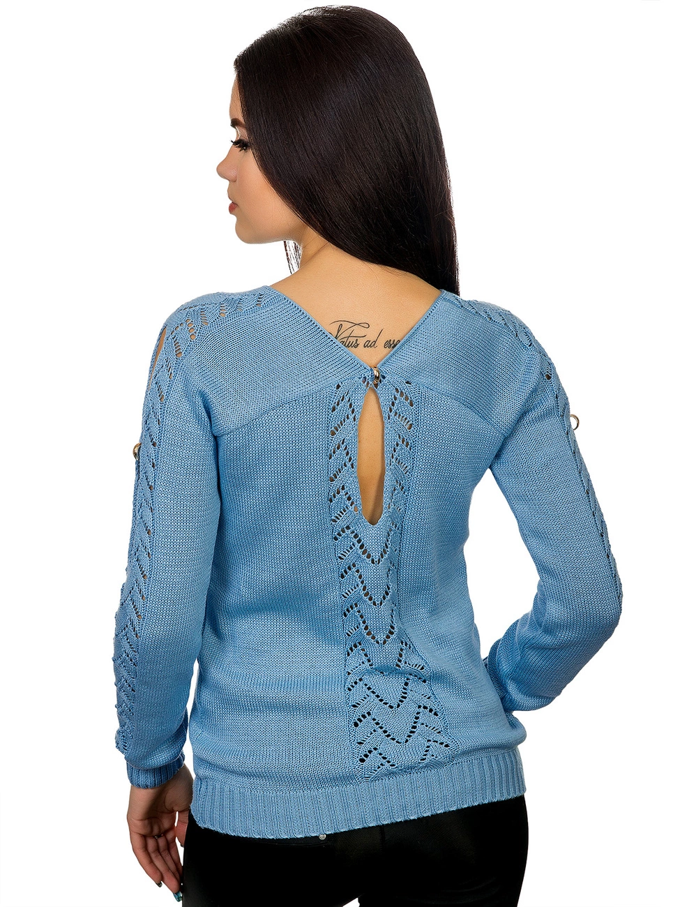украшенный ажурной вязкой и вырезами с фурнитурой в виде колечек.