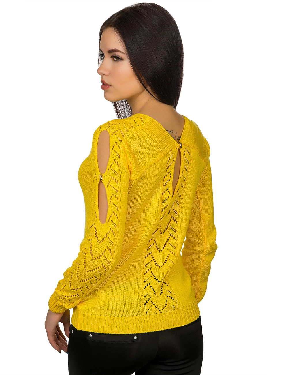 украшенный ажурной вязкой и вырезами с фурнитурой в виде колечек.