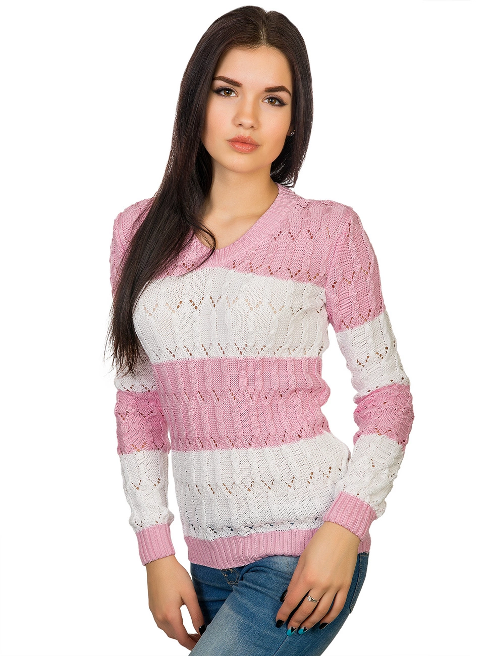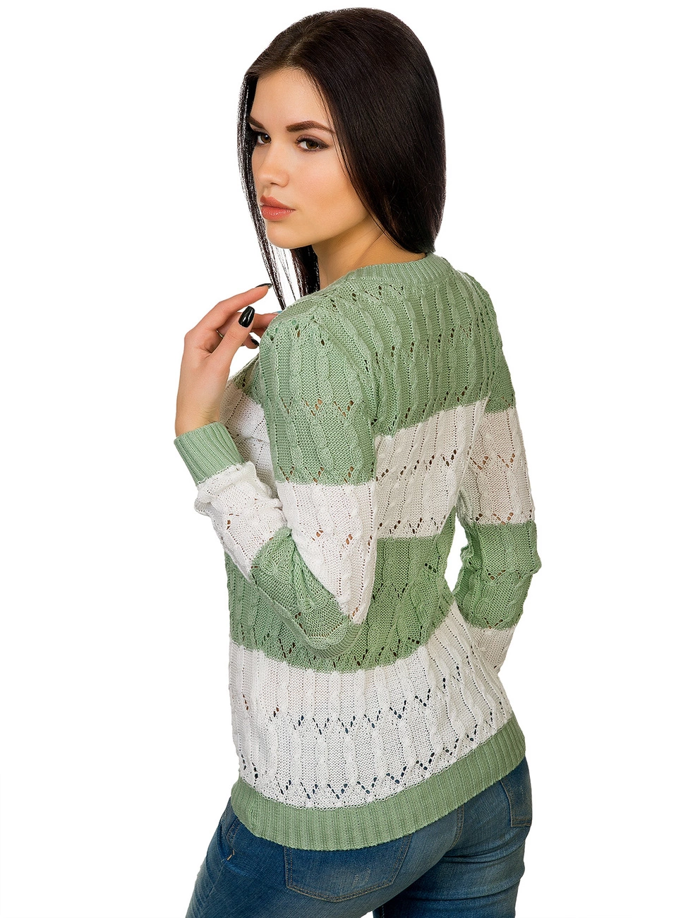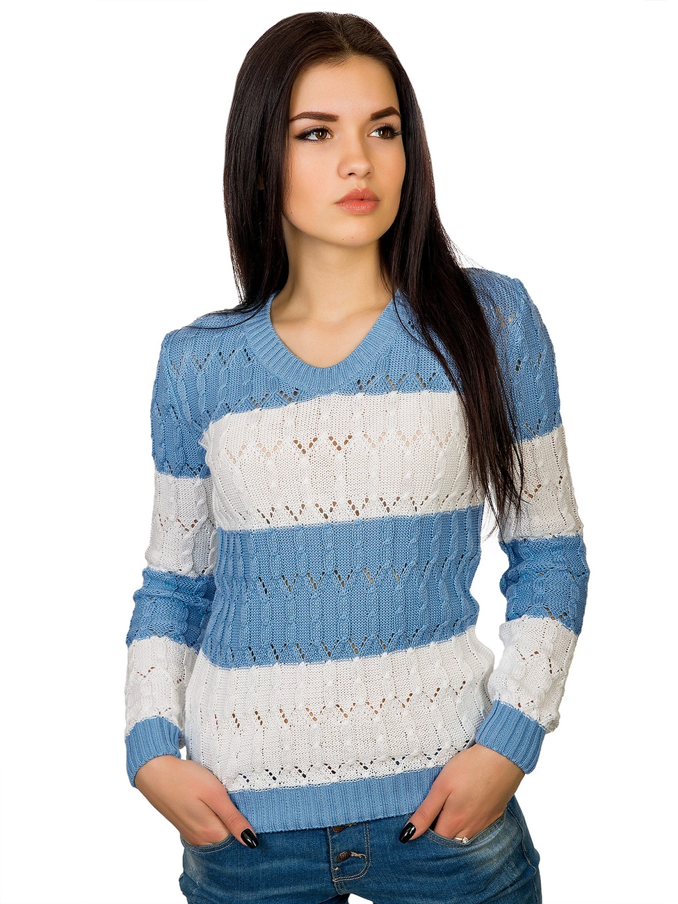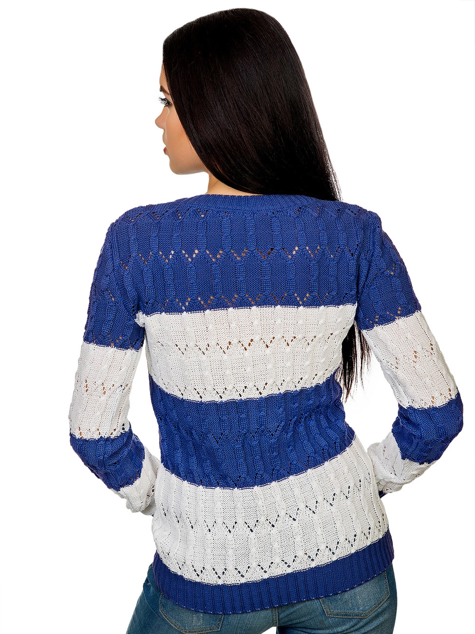 Горловина выполнена овальным вырезом. Рукава и низ изделия