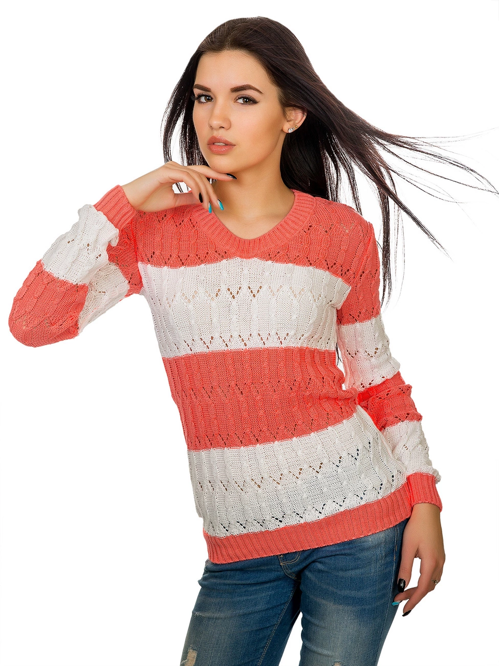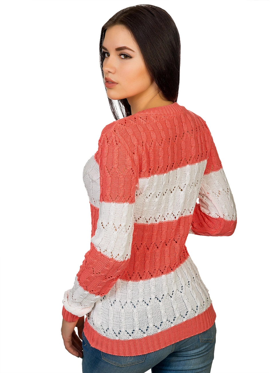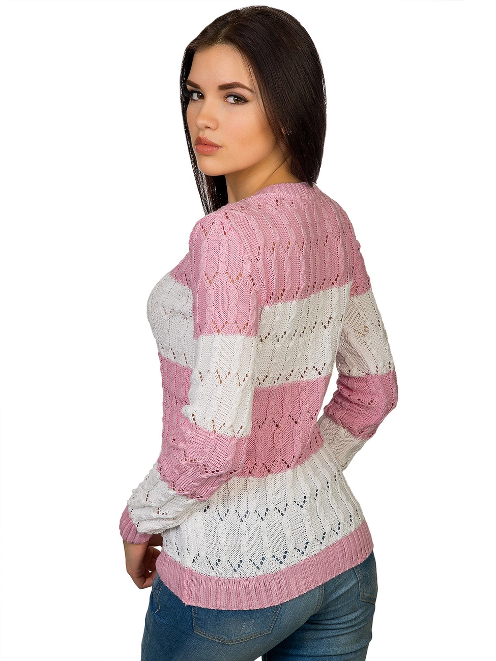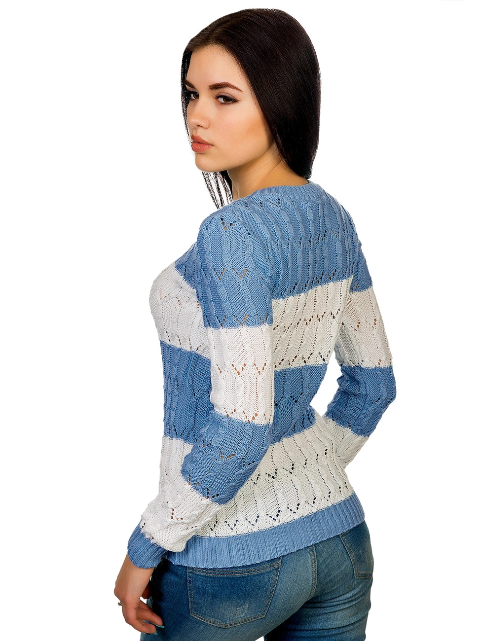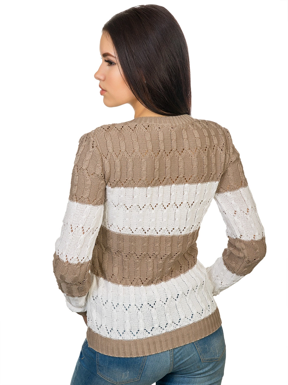 Горловина выполнена овальным вырезом. Рукава и низ изделия