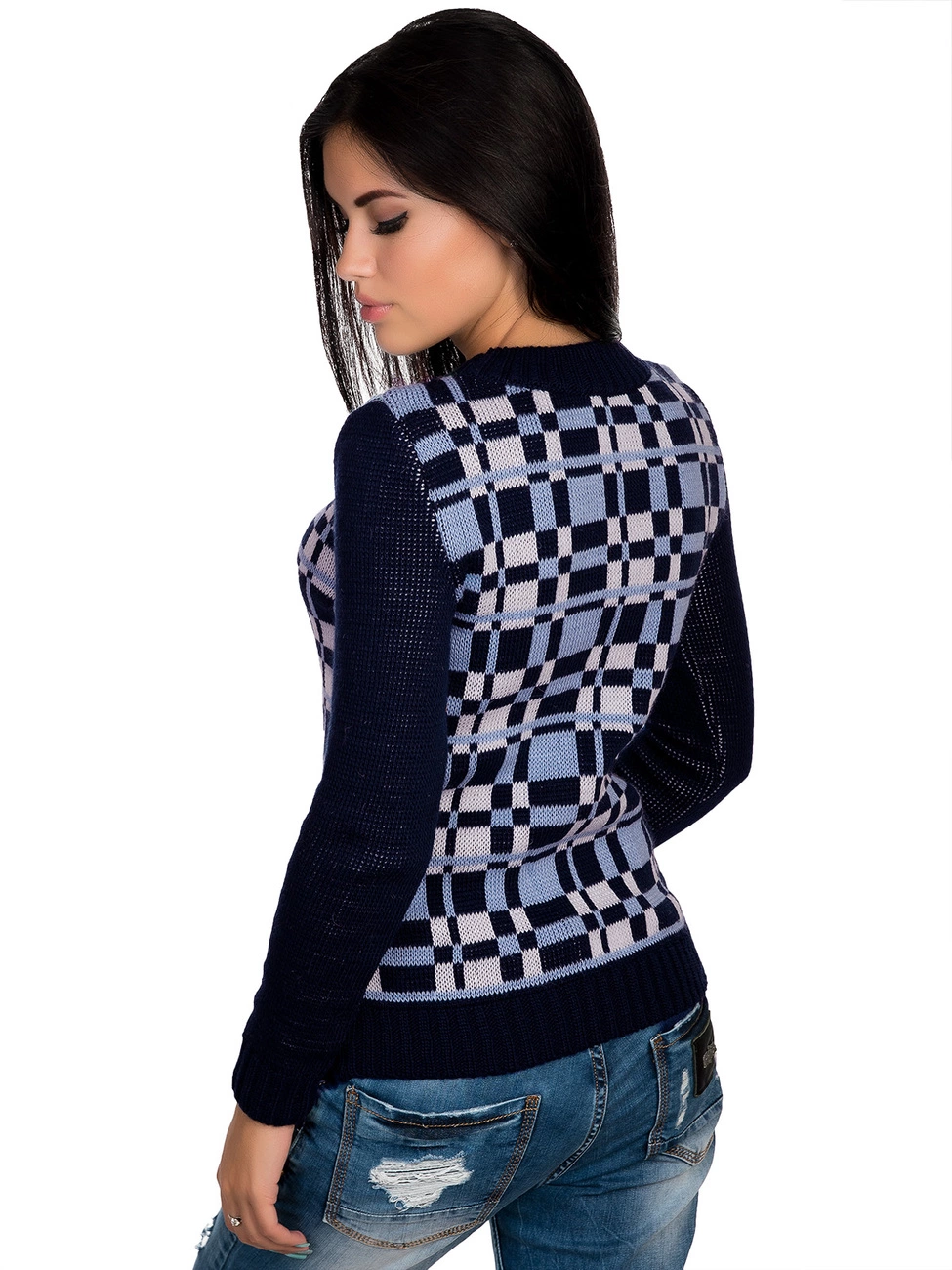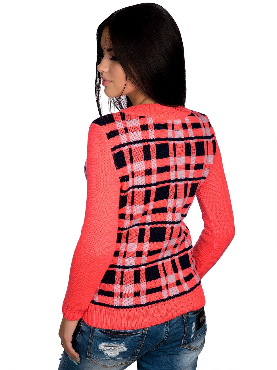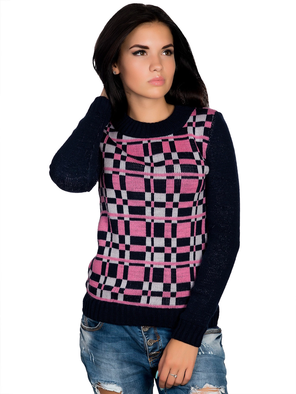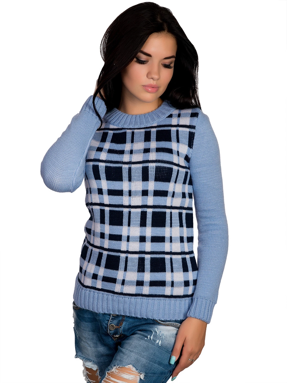 клетки. Круглая горловина, длинный рукав и низ изделия оформлены