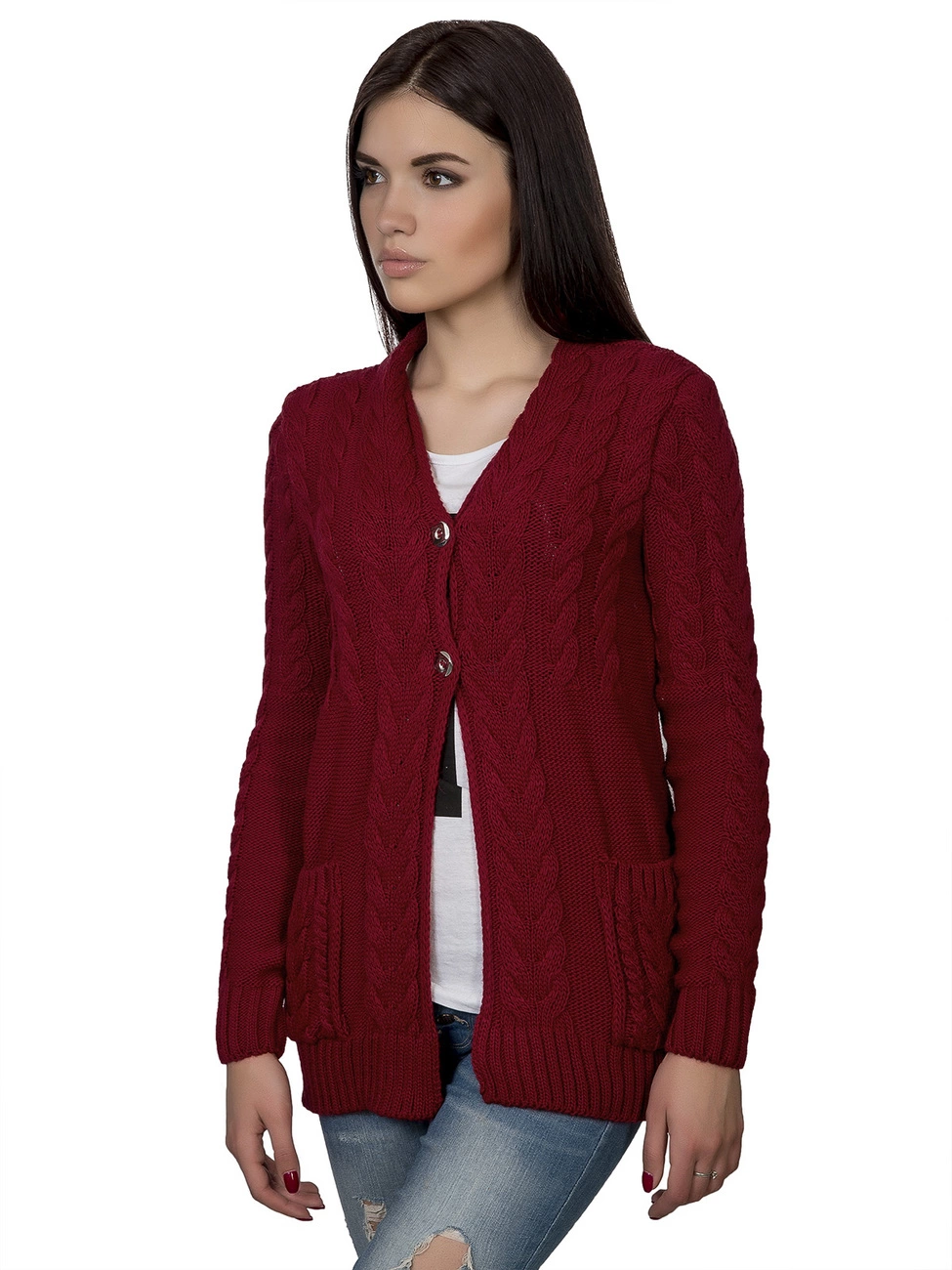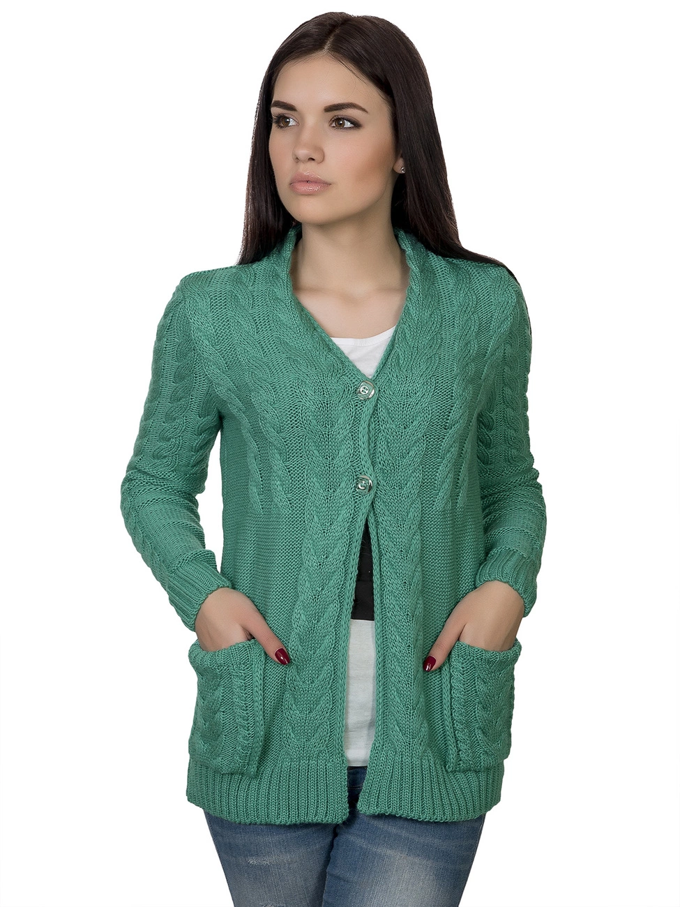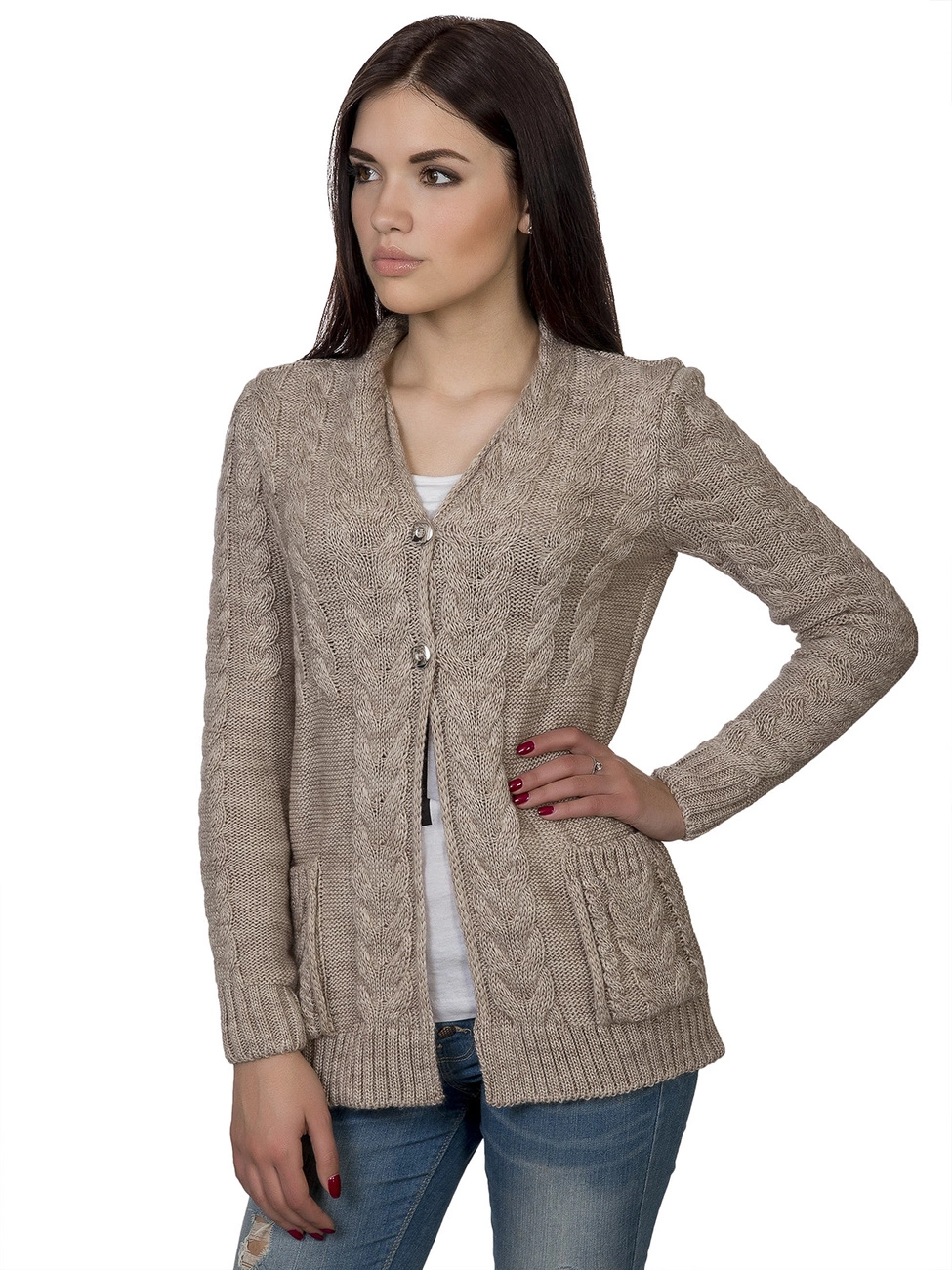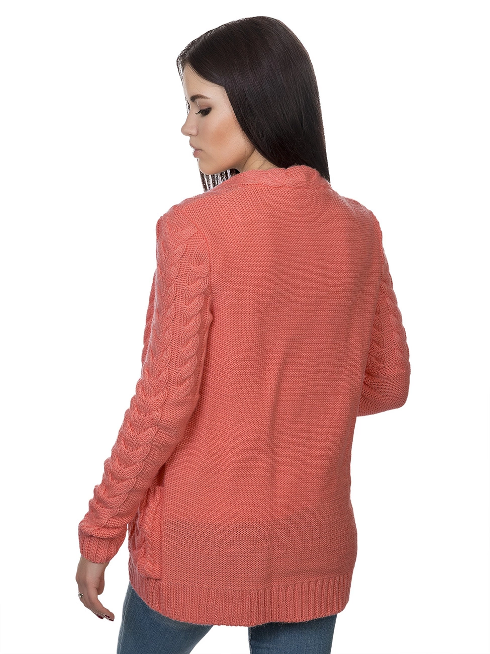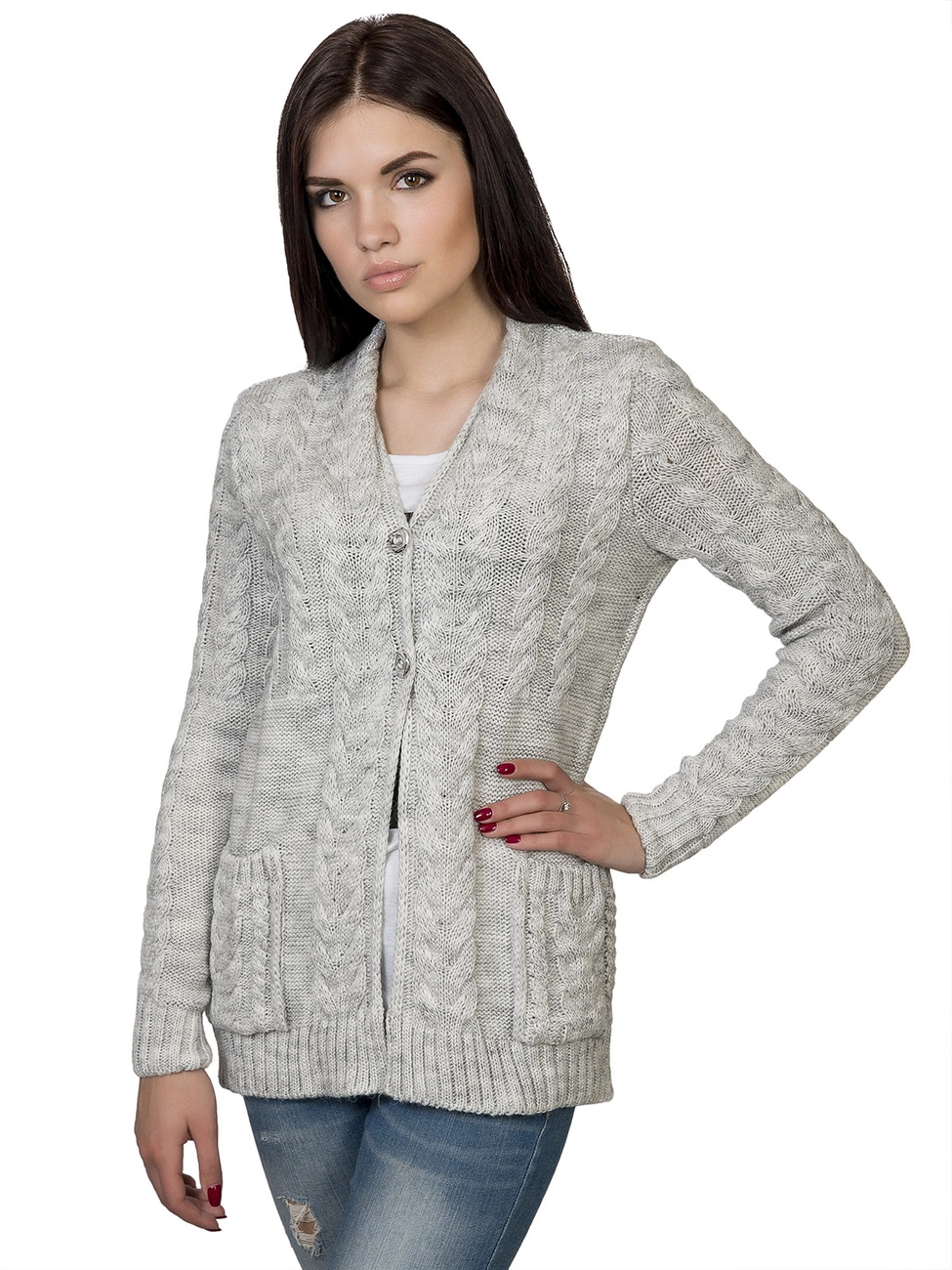 фактурным рисунком с косами. По бокам на кофте карманы, впереди