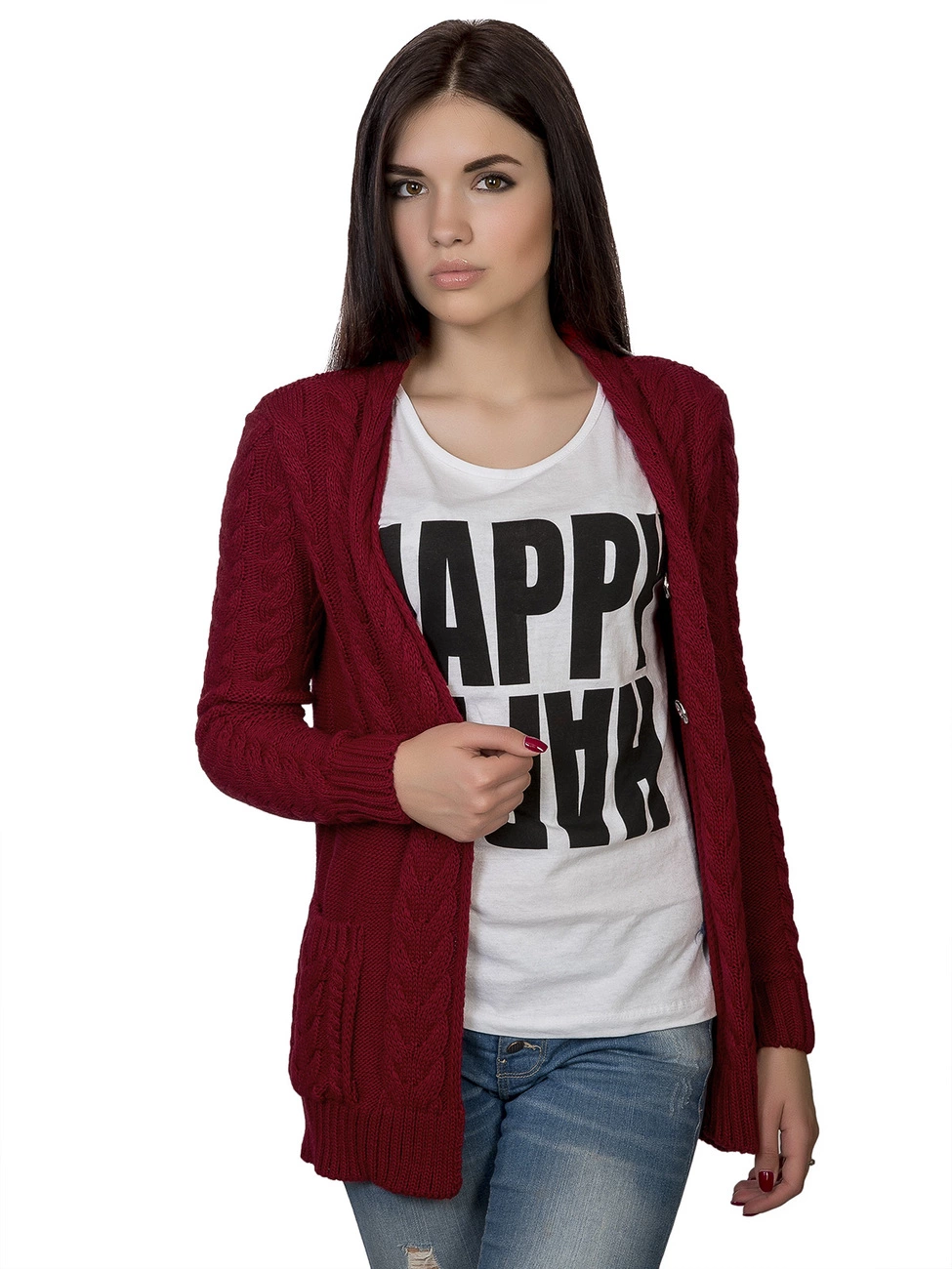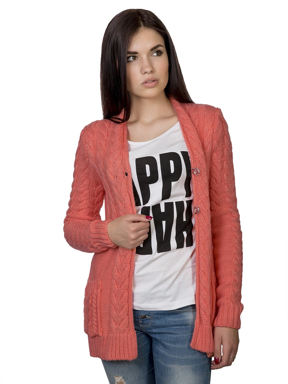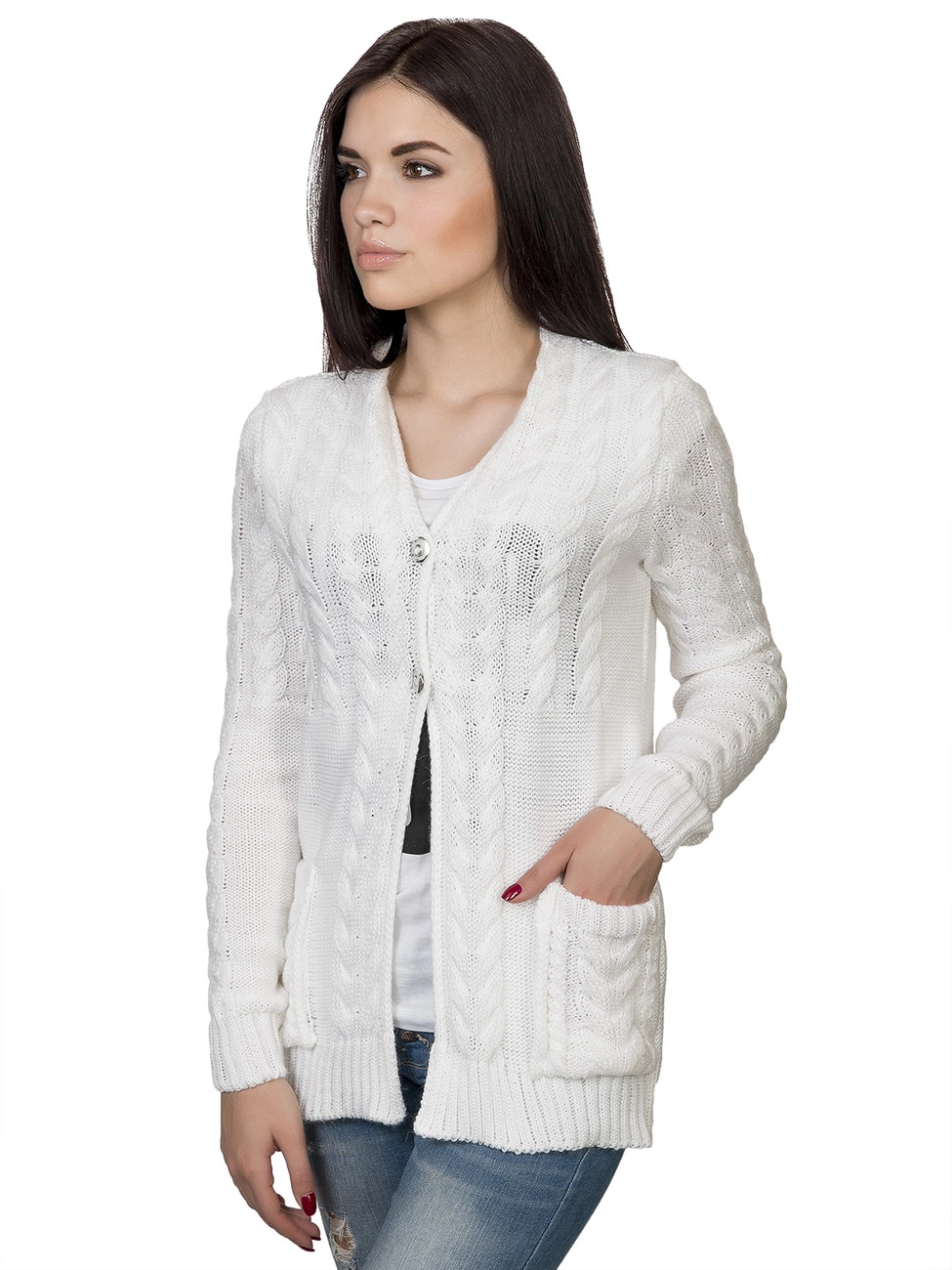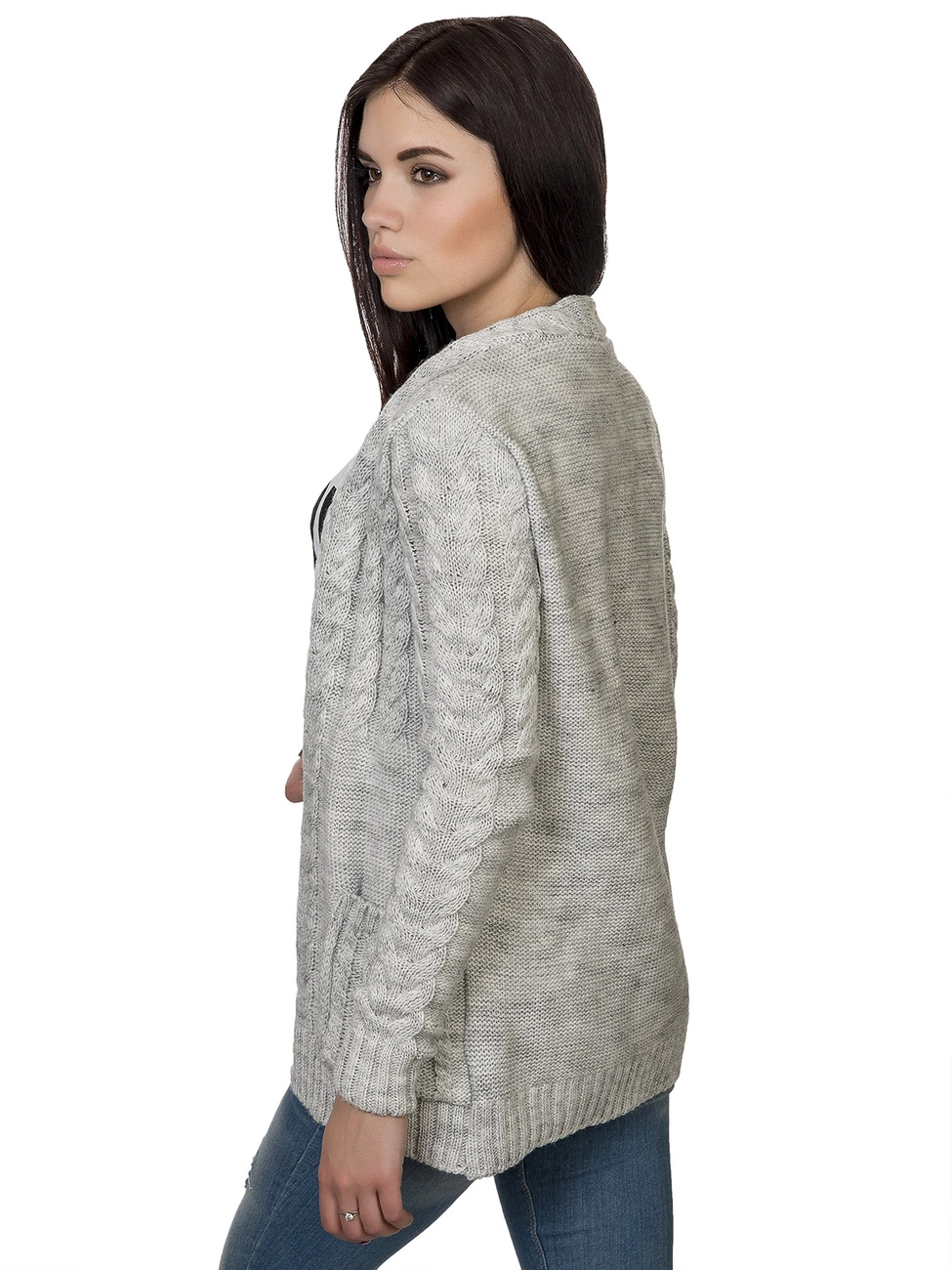фактурным рисунком с косами. По бокам на кофте карманы, впереди