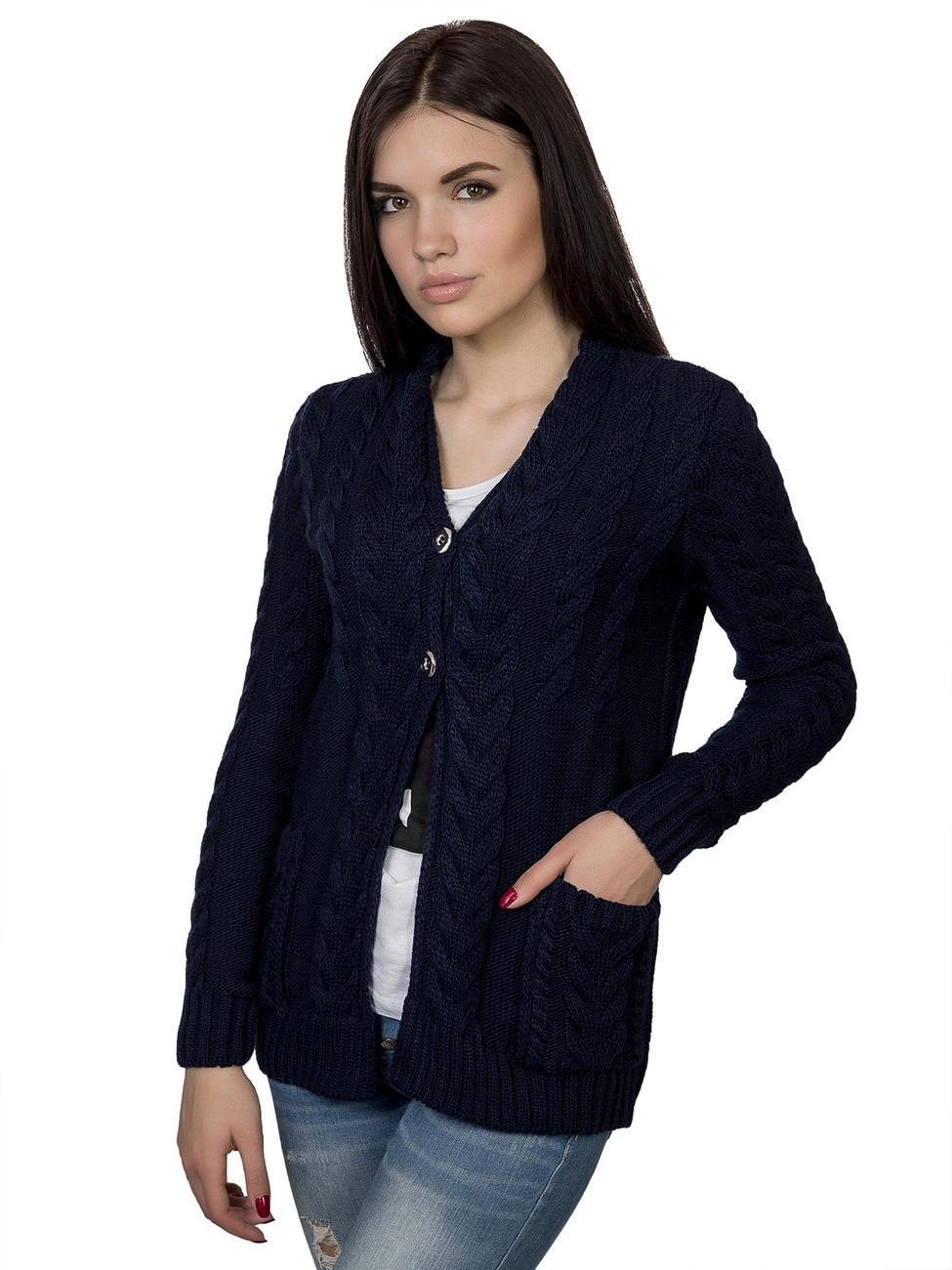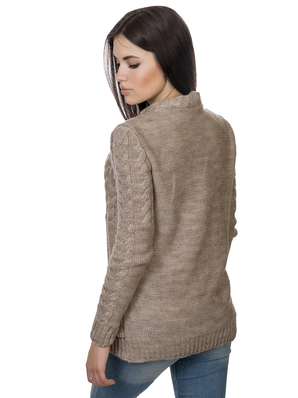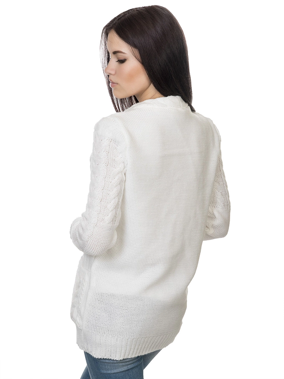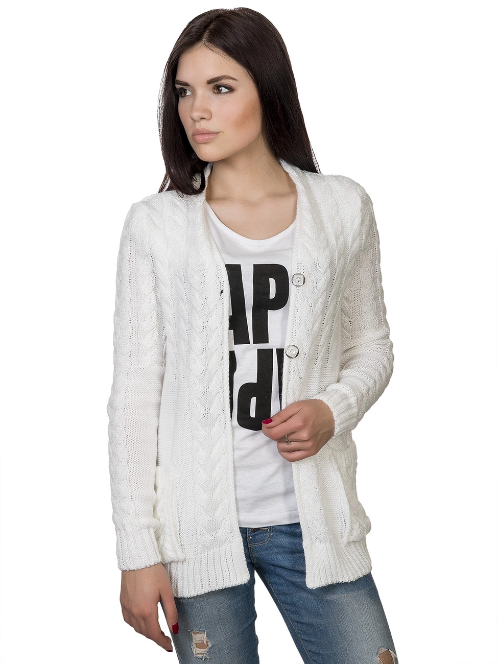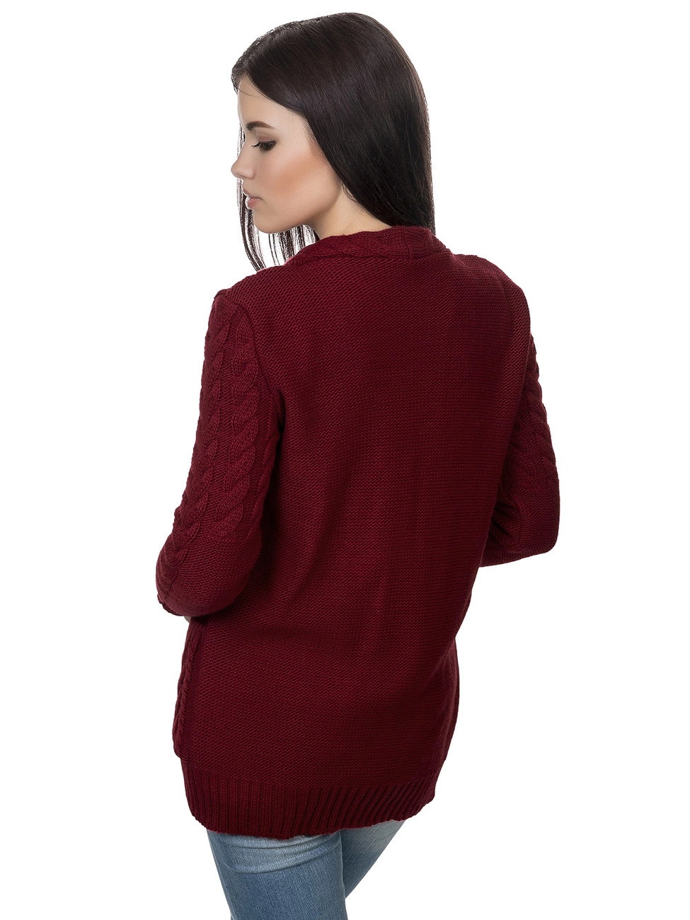 фактурным рисунком с косами. По бокам на кофте карманы, впереди