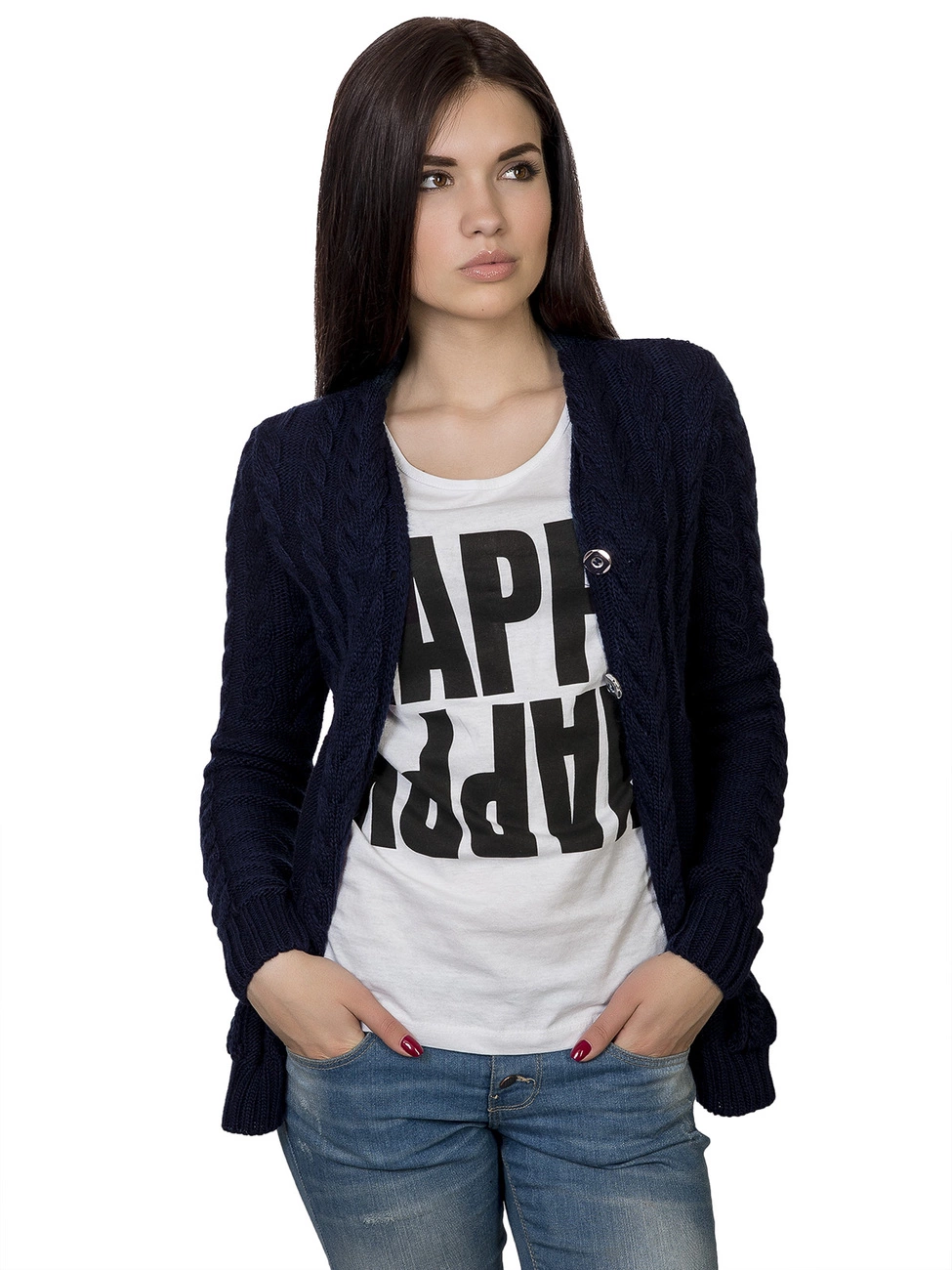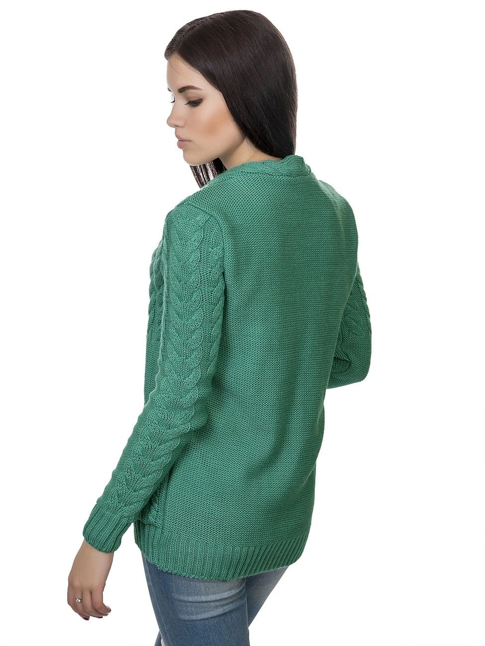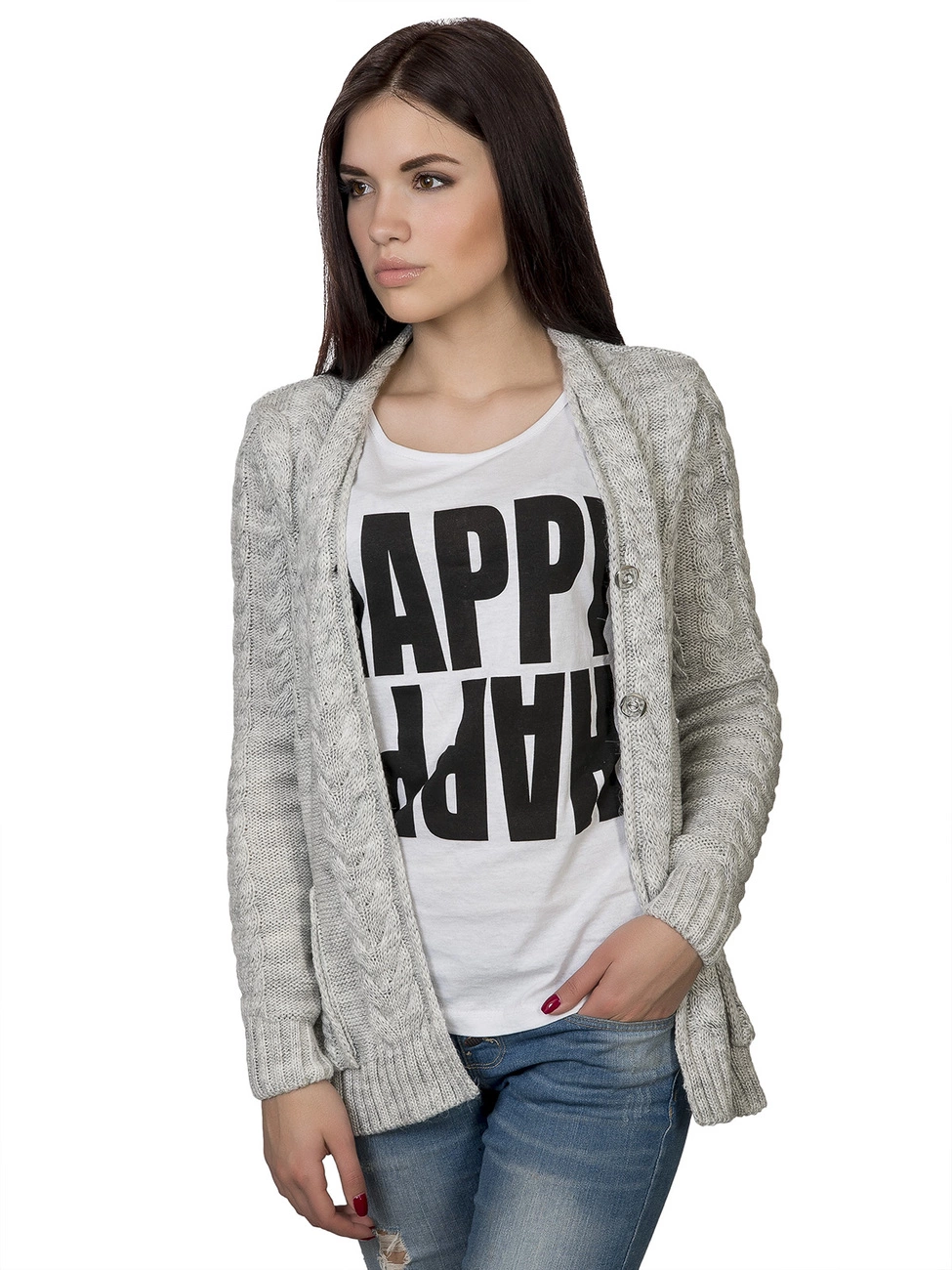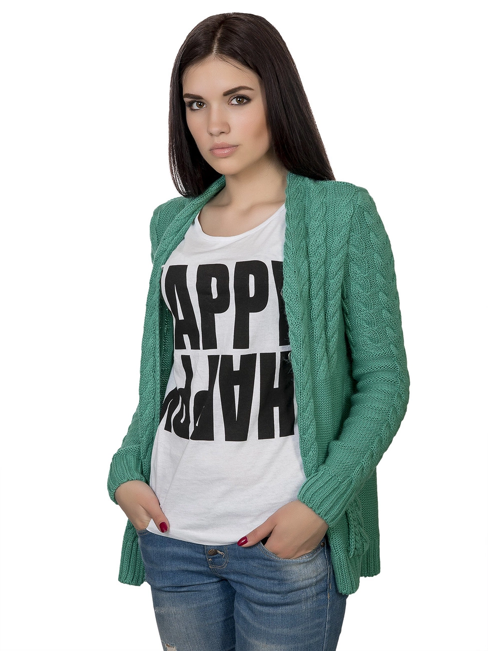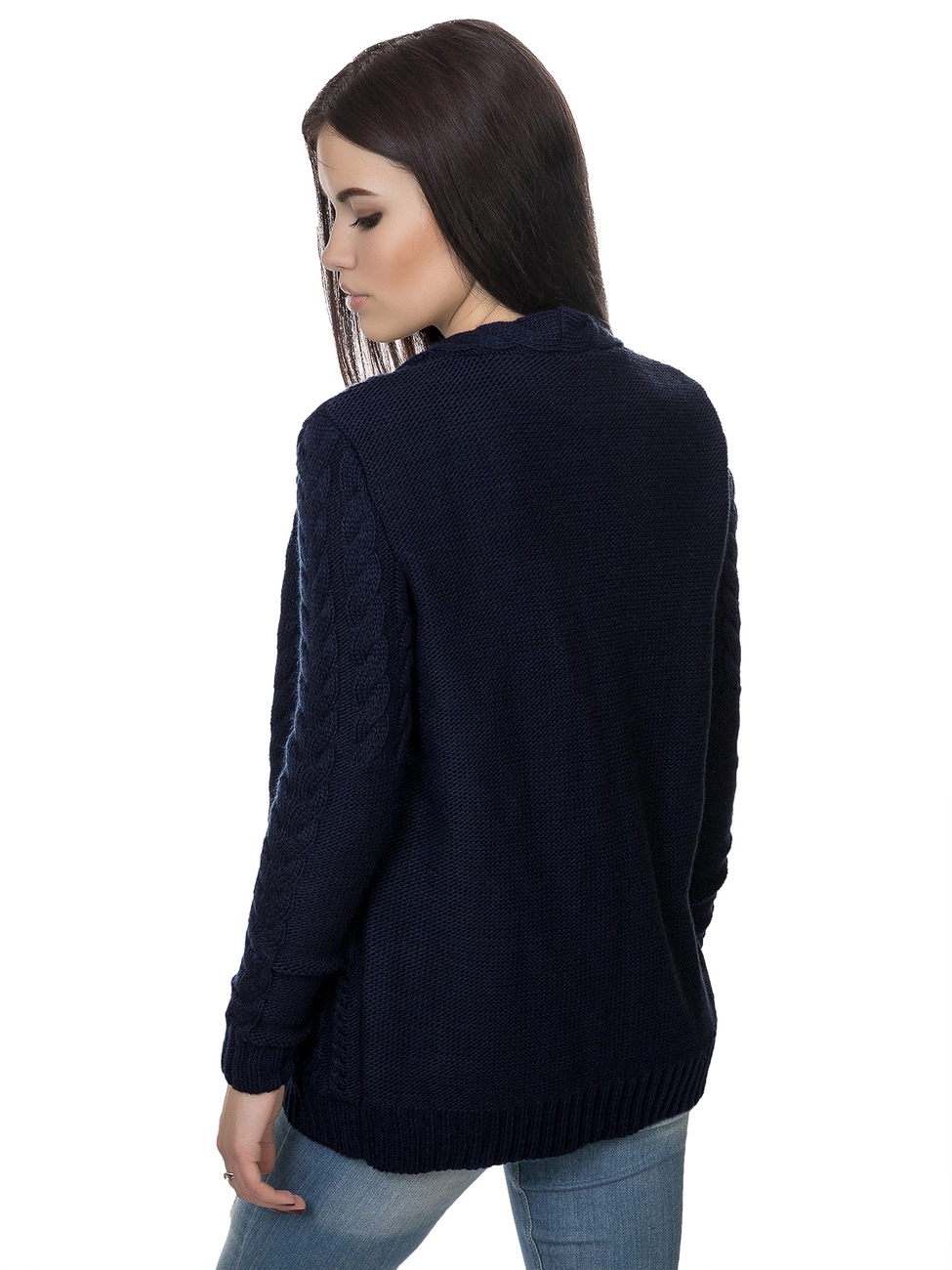 фактурным рисунком с косами. По бокам на кофте карманы, впереди